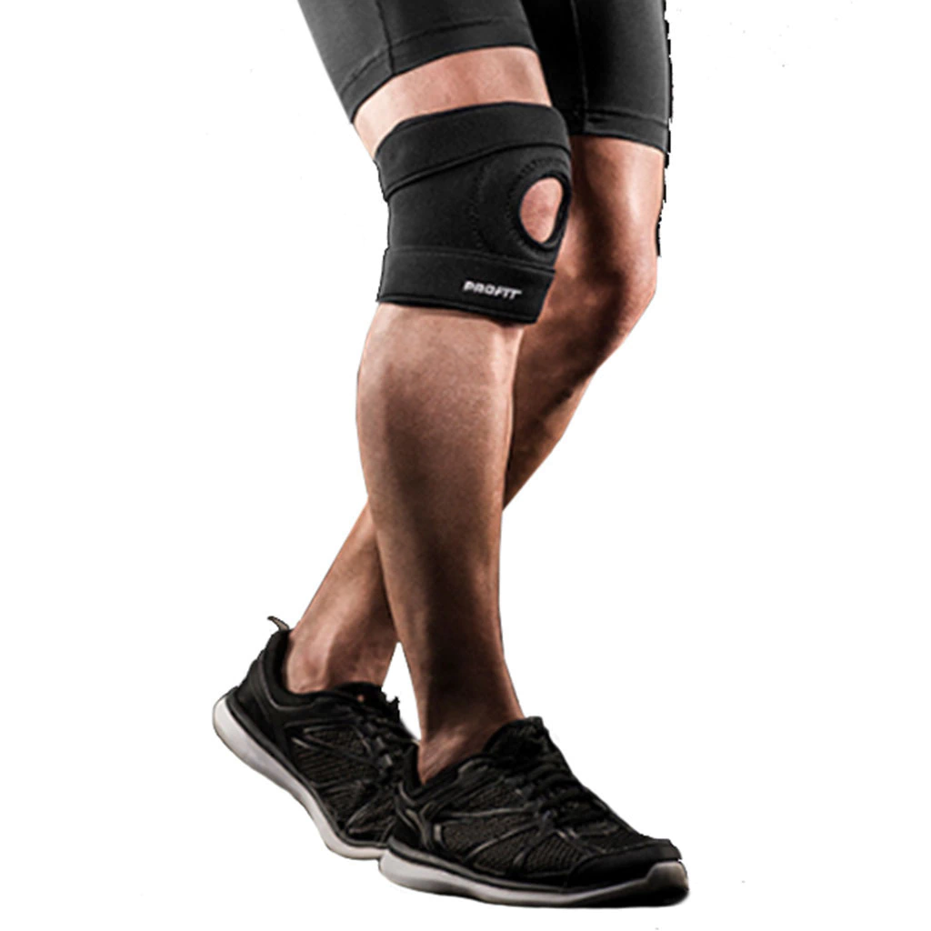 Colocar la rodillera situando el orificio sobre la rótula, el logo PROFIT se encuentra ubicado en la tira inferior.